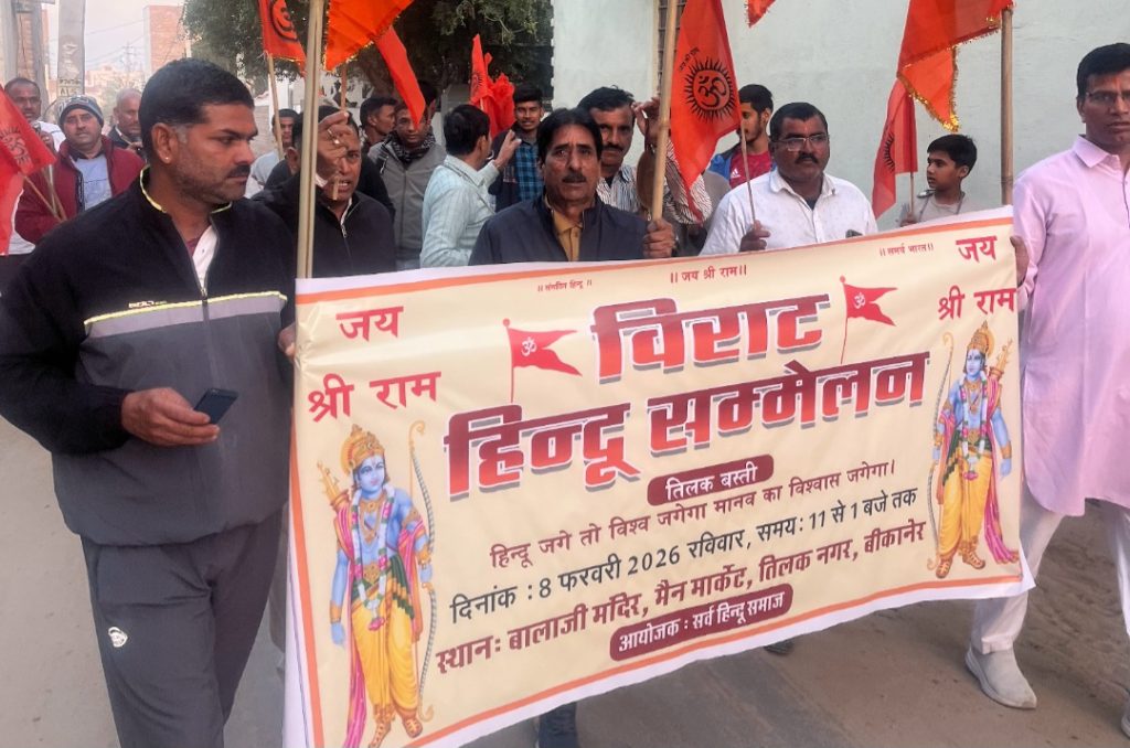 बीकानेर 06 फ़रवरी। तिलक बस्ती, शिव नगर क्षेत्र में आगामी 8 फरवरी 2026 (रविवार) को एक दिवसीय हिन्दू सम्मेलन का आयोजन किया जाएगा। यह सम्मेलन प्रातः 11:00 बजे से दोपहर 1:00 बजे तक बालाजी मंदिर, मेन मार्केट, तिलक नगर परिसर में संपन्न होगा।आयोजकों के अनुसार सम्मेलन में दाता श्री महंत, सागर मठ बीकानेर द्वारा धर्म एवं संस्कारों पर आधारित प्रवचन दिए जाएंगे। कार्यक्रम के अंतर्गत सामूहिक हनुमान चालीसा पाठ का आयोजन किया जाएगा, जिसमें बड़ी संख्या में श्रद्धालुओं के सम्मिलित होने की संभावना है।इसके अतिरिक्त, बच्चों द्वारा प्रस्तुत विभिन्न सांस्कृतिक कार्यक्रम भी सम्मेलन का आकर्षण रहेंगे, जिनके माध्यम से भारतीय संस्कृति एवं धार्मिक मूल्यों का संदेश दिया जाएगा।सम्मेलन से पूर्व प्रातः 10:00 बजे वरद हनुमान मंदिर से कलश यात्रा निकाली जाएगी, जो तिलक नगर के विभिन्न मार्गों से होती हुई कार्यक्रम स्थल बालाजी मंदिर पहुंचेगी।आयोजन समिति ने क्षेत्र के समस्त धर्मप्रेमी नागरिकों से अधिक से अधिक संख्या में उपस्थित होकर सम्मेलन को सफल बनाने की अपील की है।