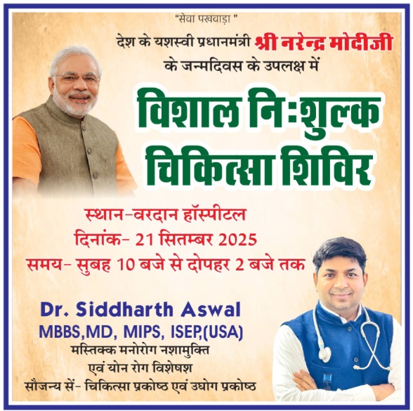 बीकानेर 20 सितंबर। देश के यशस्वी प्रधानमंत्री श्री नरेंद्र मोदी जी के जन्मदिवस के उपलक्ष्य में चिकित्सा प्रकोष्ठ एवं भाजपा शहर जिला बीकानेर के संयुक्त तत्वावधान में विशाल निशुल्क चिकित्सा शिविर दिनांक 21 सितम्बर को ITI सर्किल जेएनवी सेक्टर -1 स्थित वरदान हॉस्पिटल मे प्रातः 10 बजे से 2 बजे तक आयोजित होगा जिसमे डॉ.सिद्धार्थ असवाल MBBS,MD,,डॉ.शिव शंकर स्वामी BAMS,डॉ.पारुल यादव BDS4.,डॉ.नरेंद्र स्वामी BVSC& AH व डॉ .मोनिका असवाल BDS आदि अपनी सेवाएं देंगे।शिविर में शुगर एवं बीपी की जांच निशुल्क की जाएगी।