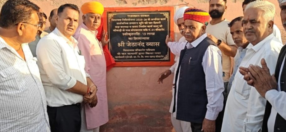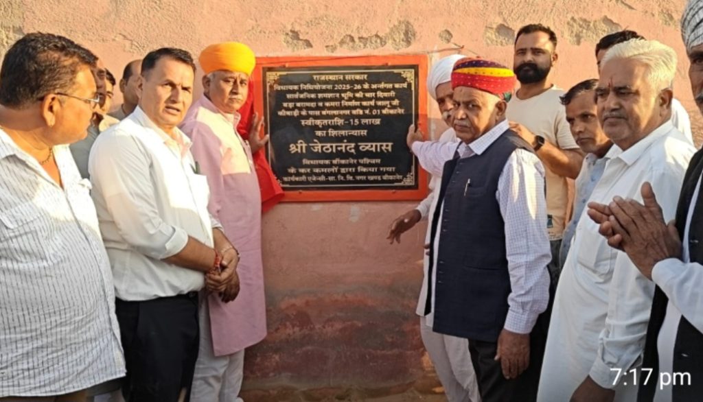 बीकानेर, 14 नवम्बर। बीकानेर (पश्चिम) विधायक जेठानंद व्यास ने शुक्रवार को विधायक निधि से स्वीकृत कार्यों का शिलान्यास और लोकार्पण किया।उन्होंने बंगला नगर स्थित आलूजी की बाड़ी के सार्वजनिक श्मशान भूमि की चारदीवारी, बड़ा बरामदा और कमरा निर्माण कार्य का शिलान्यास किया। इस पर 15 लाख रुपए होंगे। उन्होंने इस कार्य को समयबद्ध और गुणवत्ता से पूर्ण करने के निर्देश दिए। वहीं एलएम स्पोर्ट्स कांप्लेक्स में विधायक निधि से 7 लाख रुपए की लागत से स्थापित 14.50 किलोवाट के सोलर कार्य का उद्घाटन किया। उन्होंने कहा कि यह कार्य खिलाड़ियों के लिए लाभदायक साबित होगा। विधायक के कहा कि बीकानेर में सोलर ऊर्जा की अपार संभावनाएं हैं। इसे देखते हुए विधायक निधि से यह कार्य करवाया जा रहा है। विधायक ने कहा कि इससे एलएम स्पोर्ट्स कांप्लेक्स, विद्युत के क्षेत्र में आत्मनिर्भर बनने की ओर अग्रसर होगा। उन्होंने कहा कि क्षेत्र में आधारभूत सुविधाओं के विकास में किसी प्रकार की कमी नहीं आने दी जाएगी। सरकार के विभिन्न मदो के अलावा विधायक निधि से भी ऐसे कार्य कर करवाए जाएंगे।इन कार्यक्रमों में भोमराज जाट, जालूराम सियाग, रामेश्वर गोदारा, अर्जुन कुमावत, लालचंद कुमावत, हड़मान कस्वा, माणक सारण, भानू गोदारा, आदूराम सियाग, भंवर नाई, मालचंद सोनी, जे पी व्यास, चोरूलाल सुथार, किशन चौधरी, दिनेश चौहान, आशा आचार्य, विशाल गोलछा, रघुनंदन आचार्य, मिश्री बाबू जनागल, आरती आचार्य, सुषमा बिस्सा कमल सांखला, मनोज रावत अधिशासी अभियंता, सुभाष स्वामी अधिशासी अभियन्ता सानिवि सहित अनेक लोग मौजूद रहे।